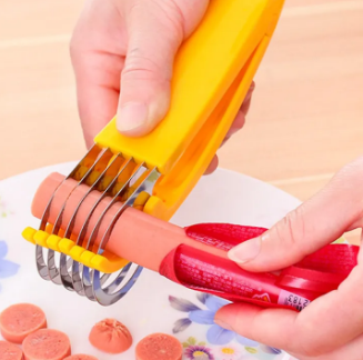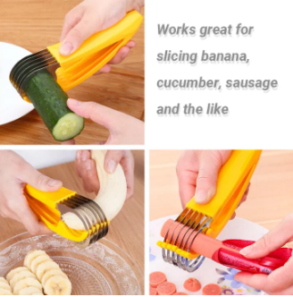 Feature:Perfectly slice whole bananas in seconds with this creative kitchen tool.The sausage slicer has 6 blades, can cut 6 portioned at a time.Large ergonomic handle design, safe and comfortable, will not cause any damage, harm or injuries for your fingers.The sharp stainless blades will allow you to easily cut fruits and slice vegetables in seconds.The slicer is not only for banana, but also for hotdog, cucumber, and other vegetable.